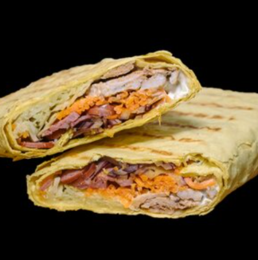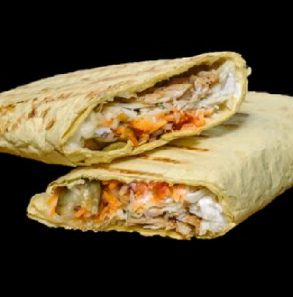 Лаваш, соус «Йогуртный», филе куриное, лук фиолетовый, капуста свежая, морковь «По-корейски», огурцы маринованные, помидор, соус «BBQ»