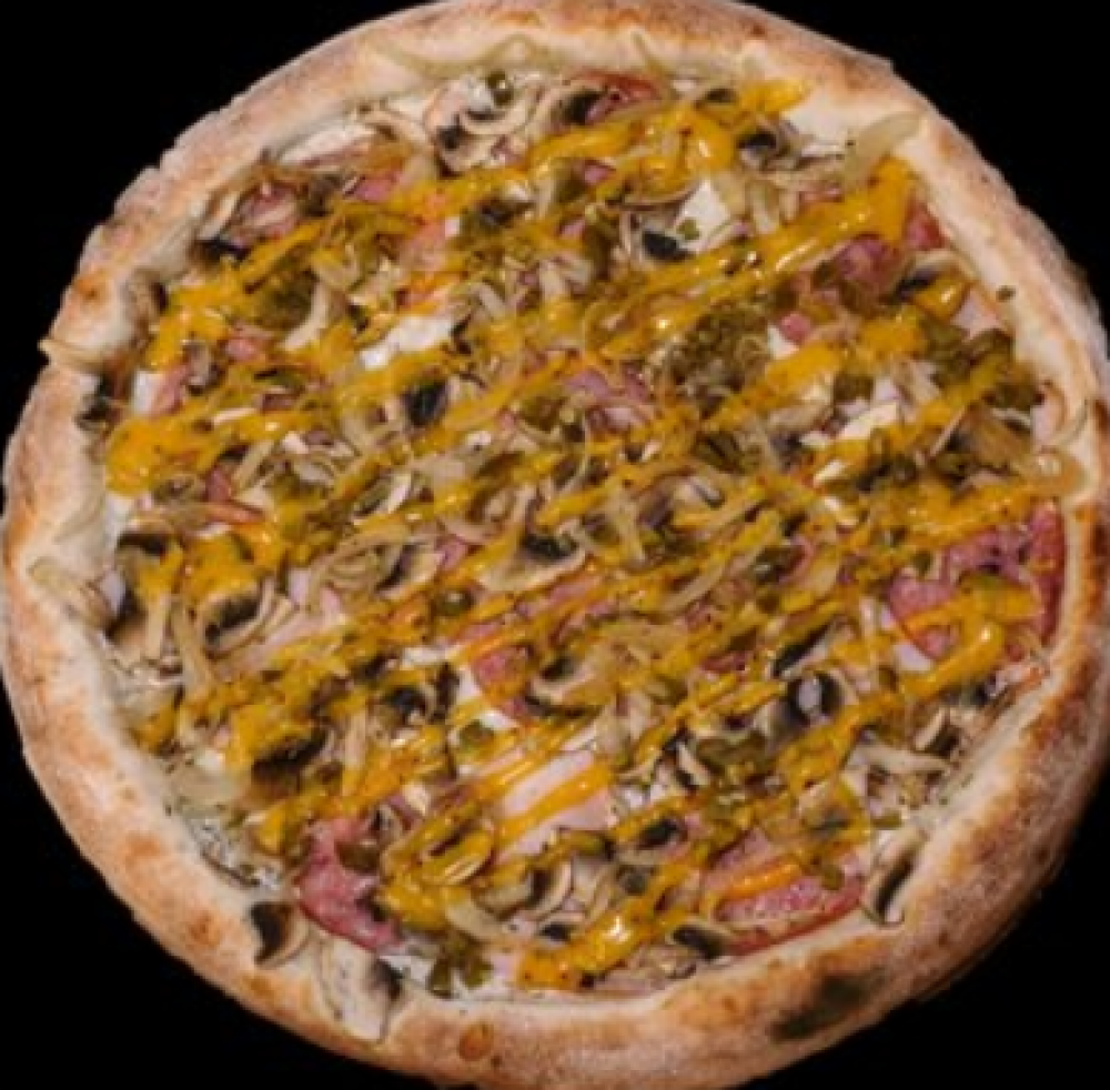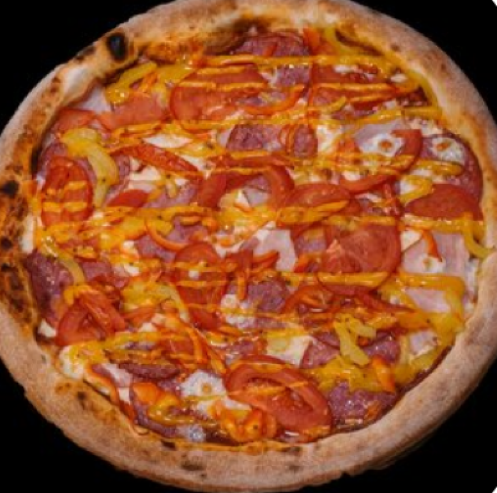 Тесто, томатный соус, сыр «Моцарелла», ветчина варено-копченая, салями варено-копченая, помидор свежий, перец, соус «Горчичный»
