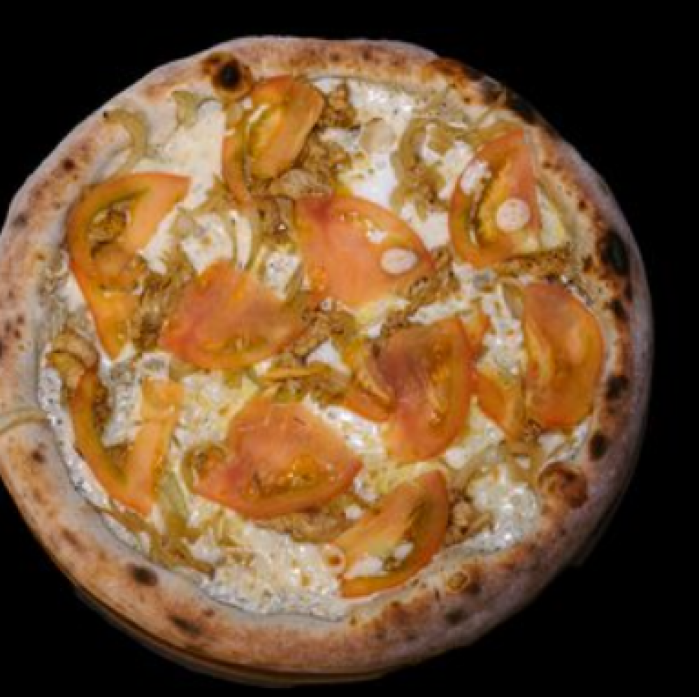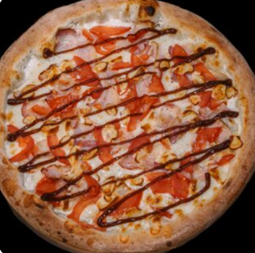 Тесто, сметанно-чесночный соус, сыр «Моцарелла», бекон сырокопченый, помидор свежий, сыр «Джил», соус «BBQ»