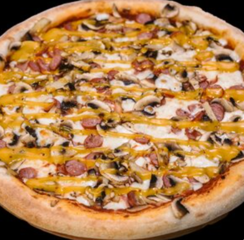Тесто, томатный соус, сыр «Моцарелла», колбаски охотничьи, шампиньоны свежие, соус «Горчичный»