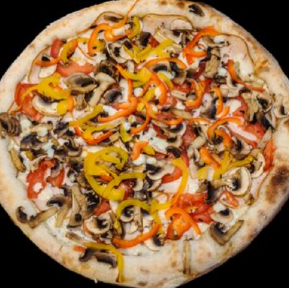 Тесто, сыр «Моцарелла», сметанно-чесночный соус, куриный рулет, шампиньоны свежие, помидор свежий, перец