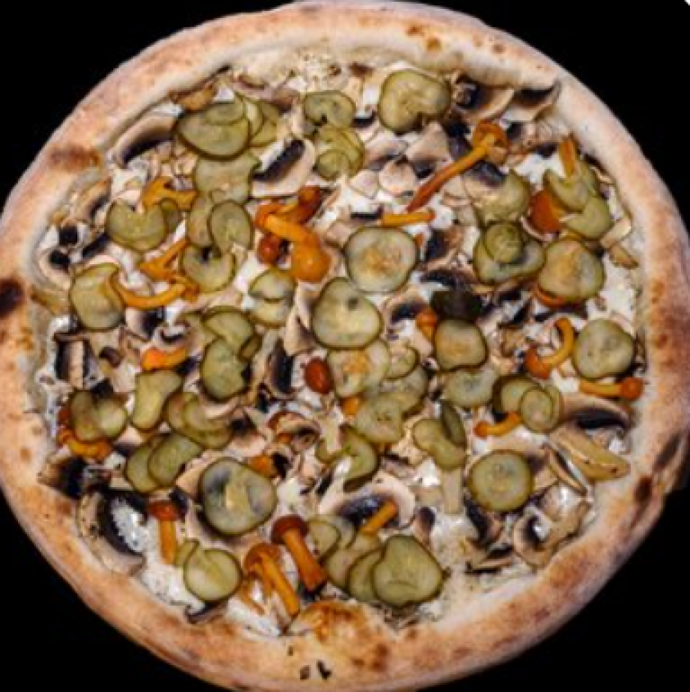 Тесто, сметанно-чесночный соус, сыр «Моцарелла», шампиньоны свежие, опята маринованные, огурец маринованный