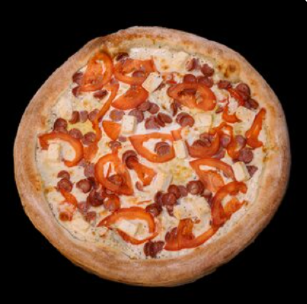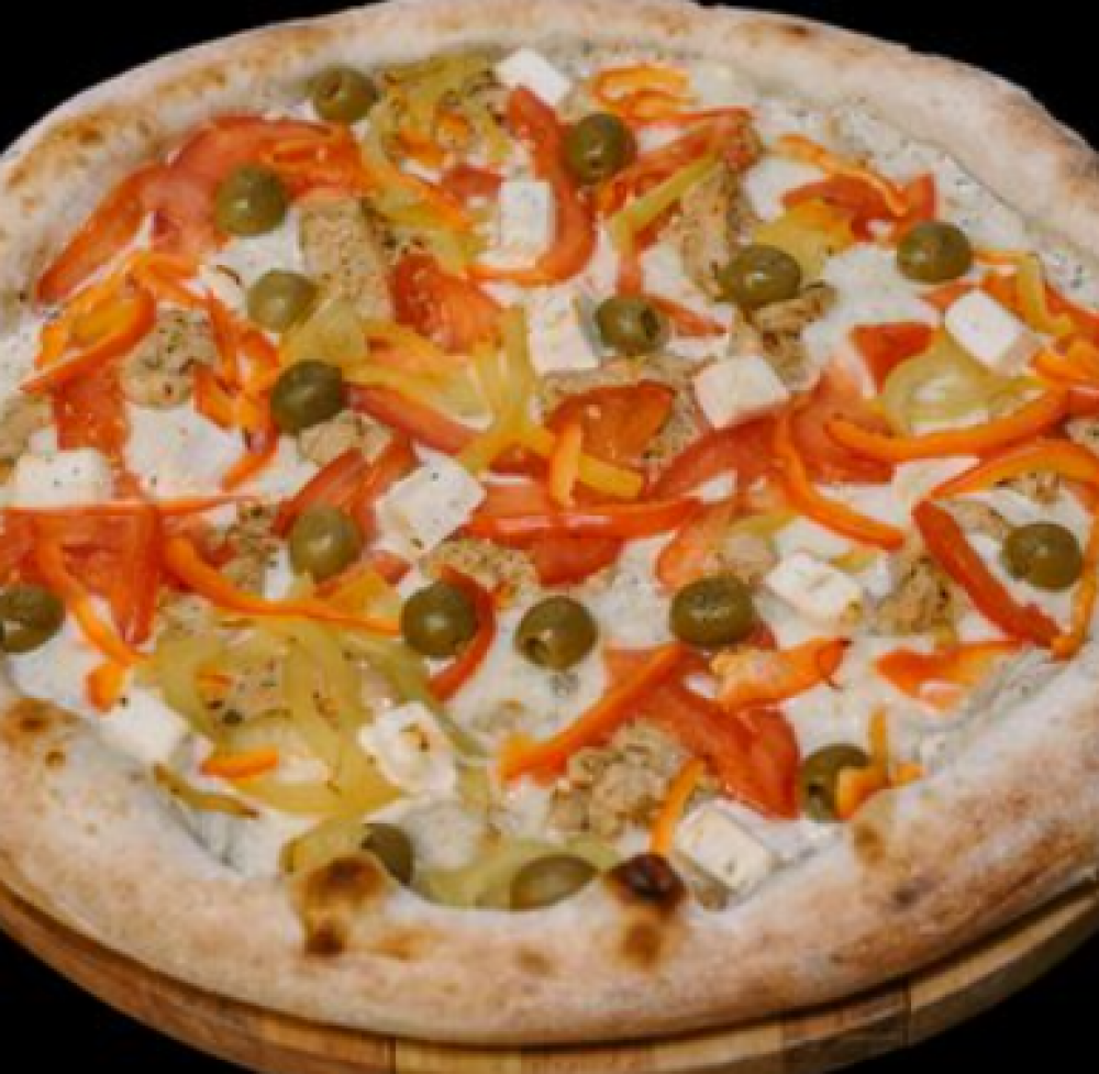 Тесто, сметанно-чесночный соус, сыр «Моцарелла», куриное филе, перец свежий, помидор свежий, сыр «Фетакса», оливки консервированные