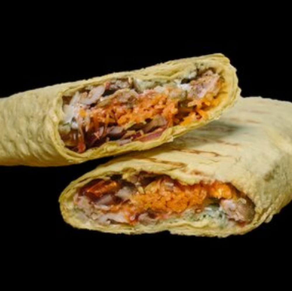 Лаваш, соус «Йогуртный», соус «Грибной», филе куриное, колбаски охотничьи, лук фиолетовый, капуста, морковь «По‑корейски»