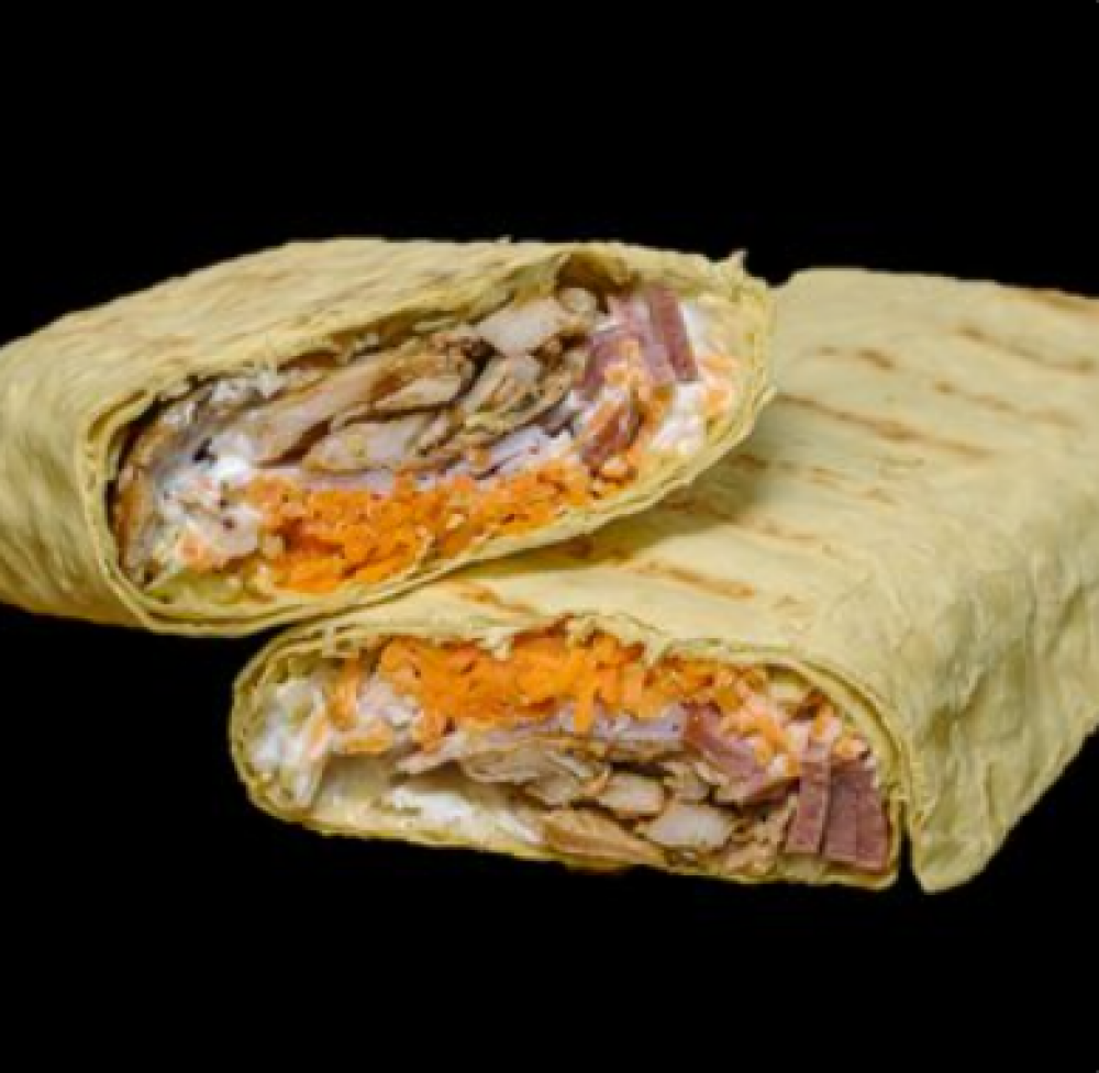 Лаваш, соус «Йогуртный», филе куриное, колбаски охотничьи, ветчина варёно-копчёная, капуста свежая, морковь «По‑корейски»