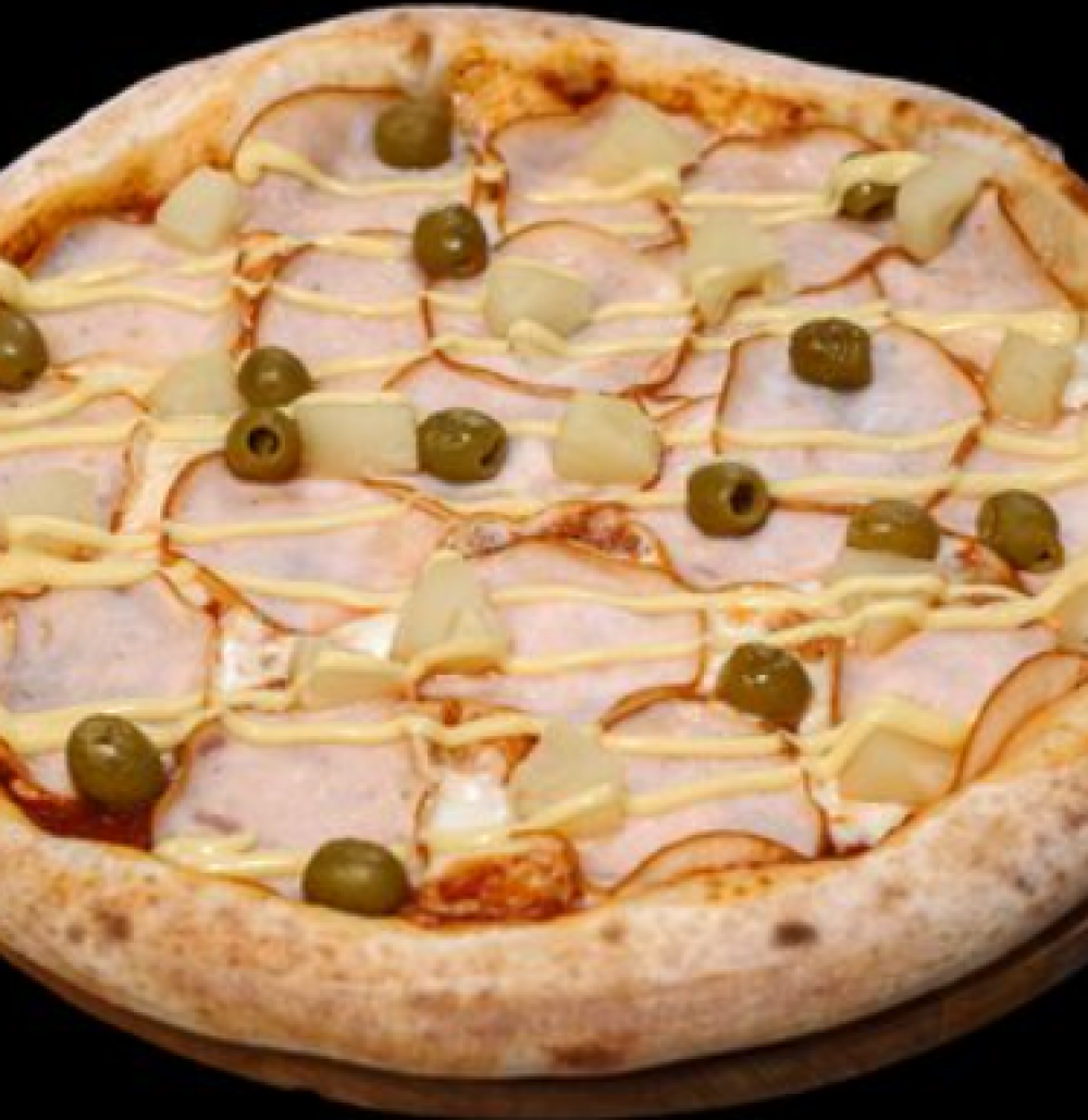Тесто, томатный соус, сыр «Моцарелла», куриный рулет, ананас консервированный, оливки консервированные, сырный соус
