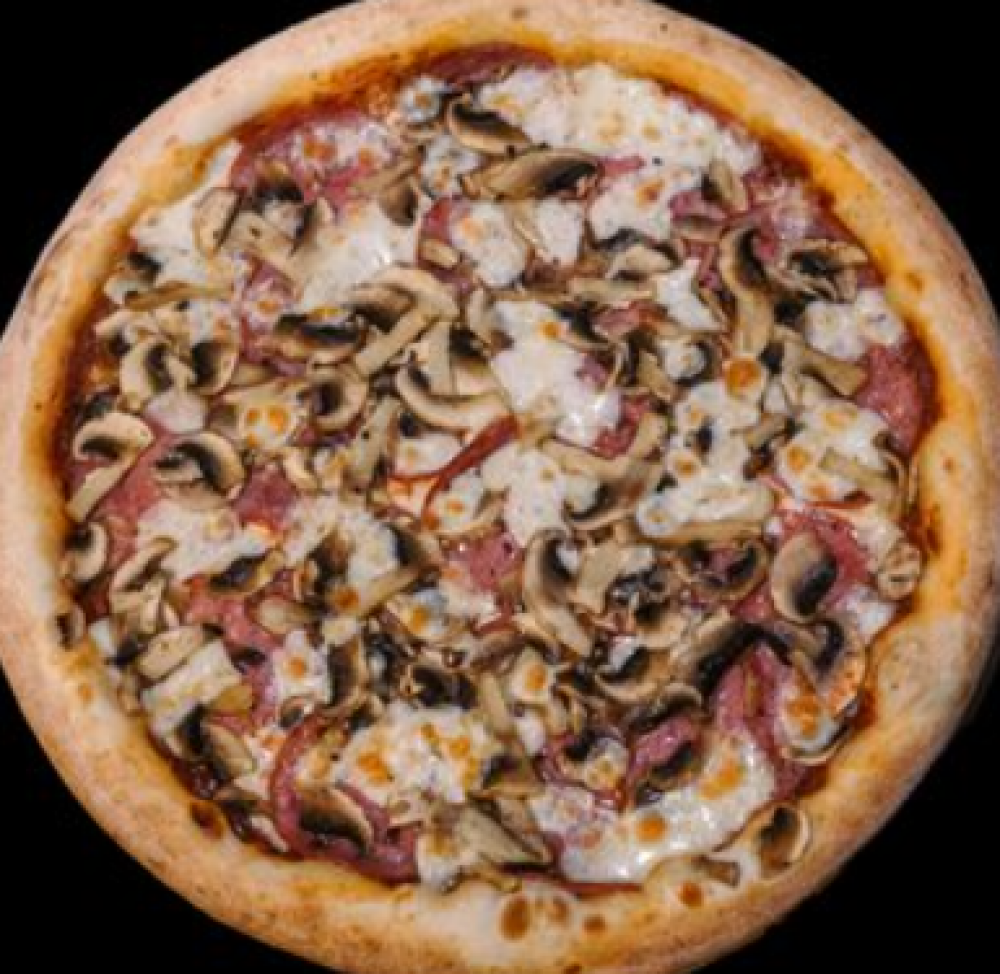 Тесто, томатный соус, сыр «Моцарелла», салями варено-копченая, шампиньоны свежие