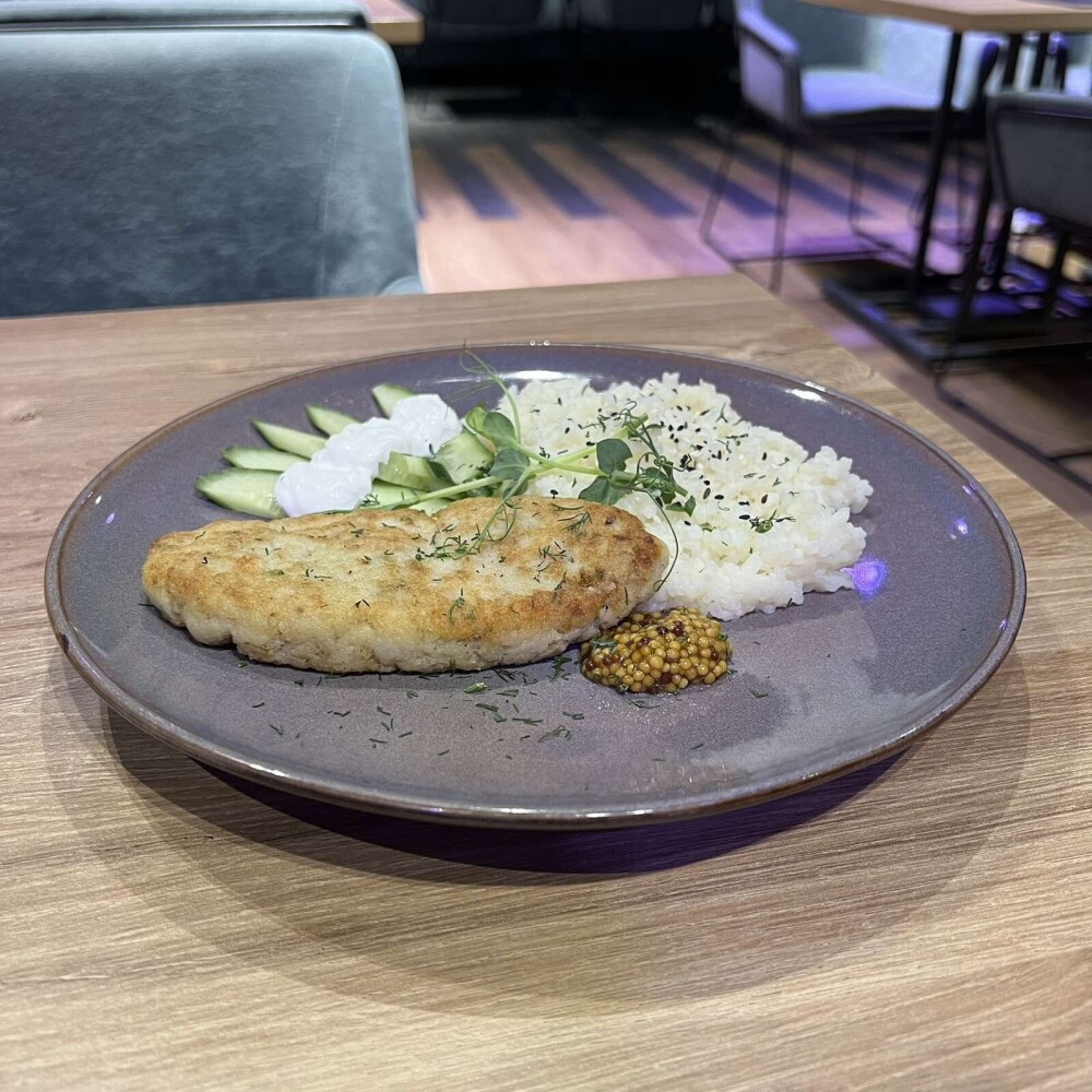 Котлета рыбная с моцареллой и шпинатом с горчицей французской