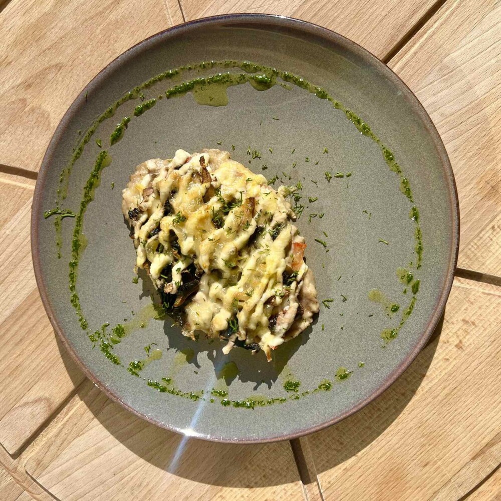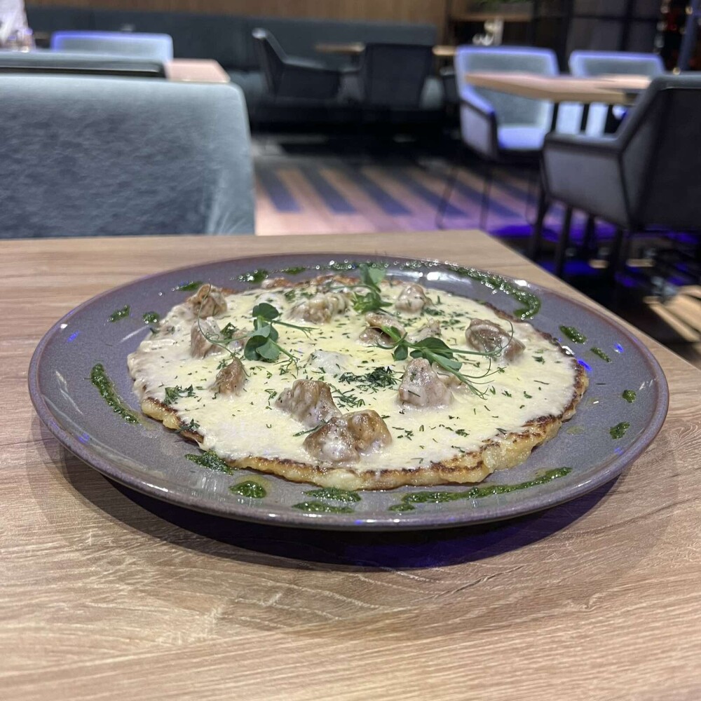 Большой картофельный драник, запеченный с мясом, луком, сметаной и сыром