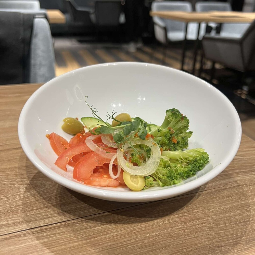 Капуста брокколи, помидоры свежие, огурцы свежие, оливки, лук маринованный, заправка