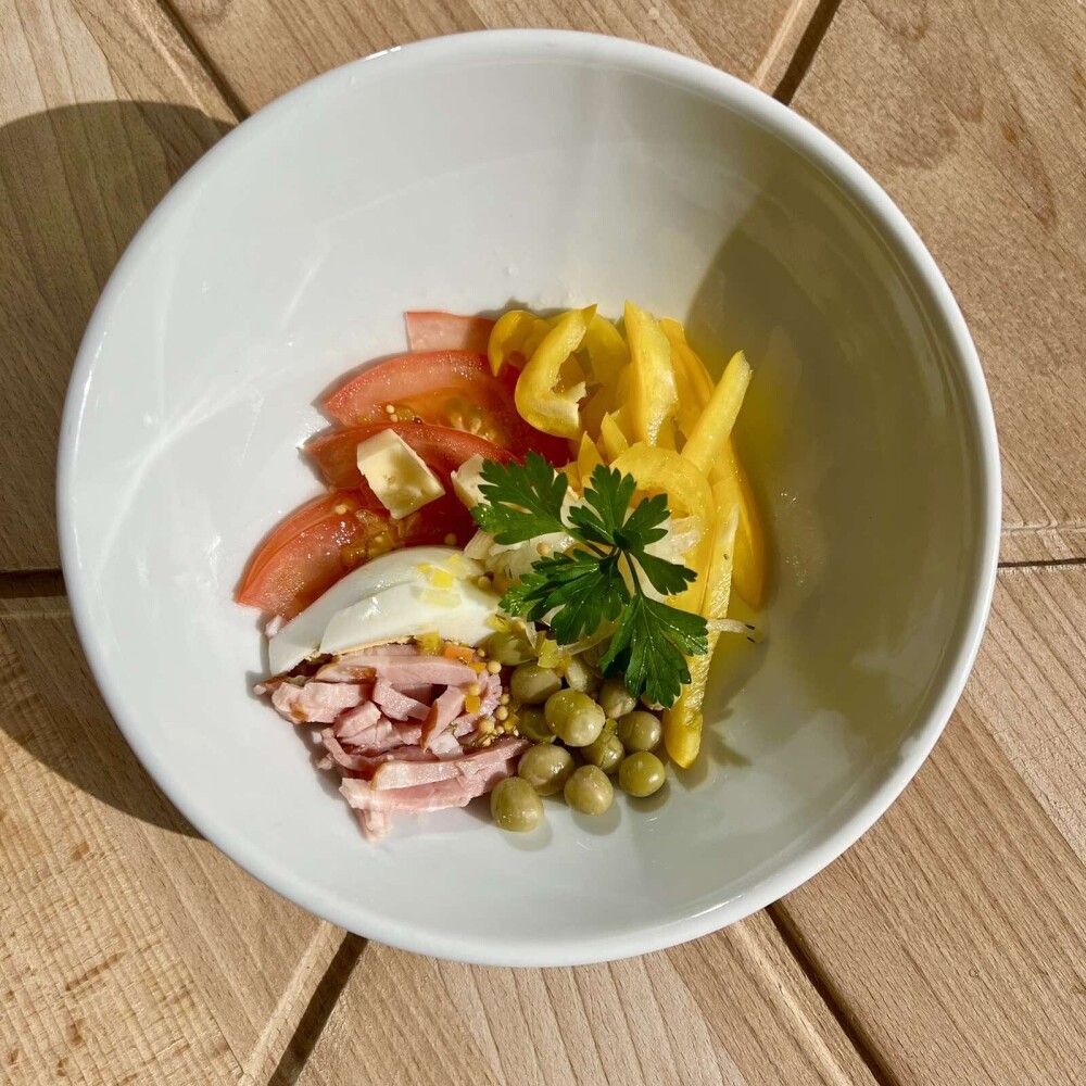 Ветчина, помидоры свежие, перец сладкий, горошек, лук маринованный, сыр, яйцо, заправка с французской горчицей