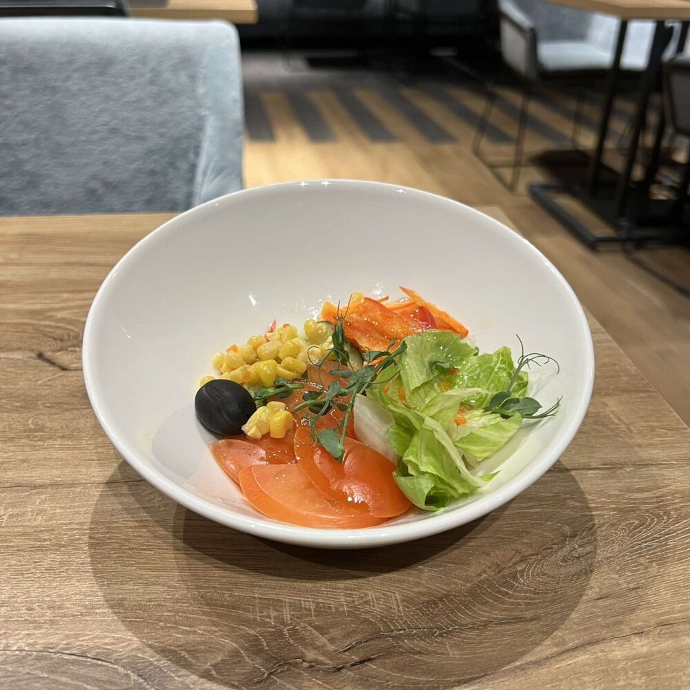 Огурцы свежие, помидоры свежие, салатные листья, перец сладкий, кукуруза, морковь свежая, маслины, заправка