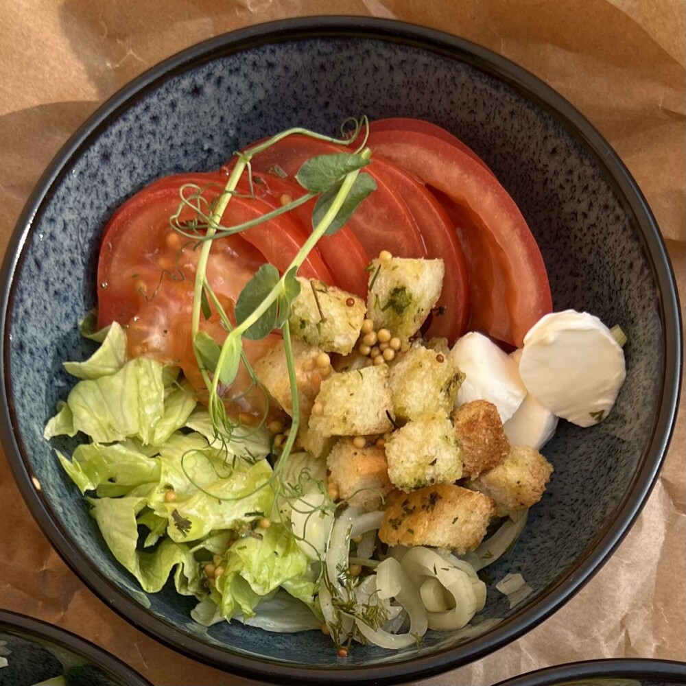 Салатные листья, помидоры свежие, сыр Моцарелла, гренки, лук маринованный, заправка с французской горчицей