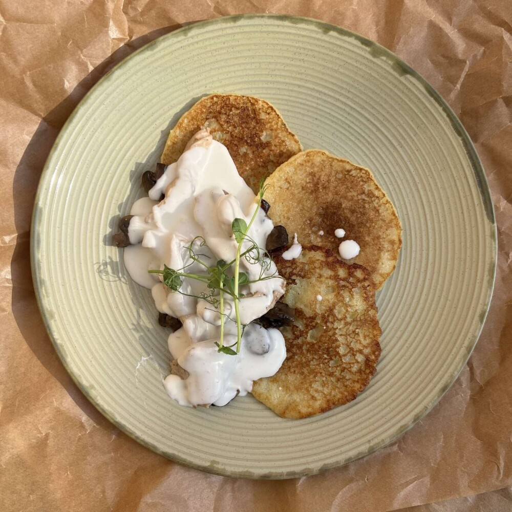 Драники под сливочным соусом с куриным филе и шампиньонами