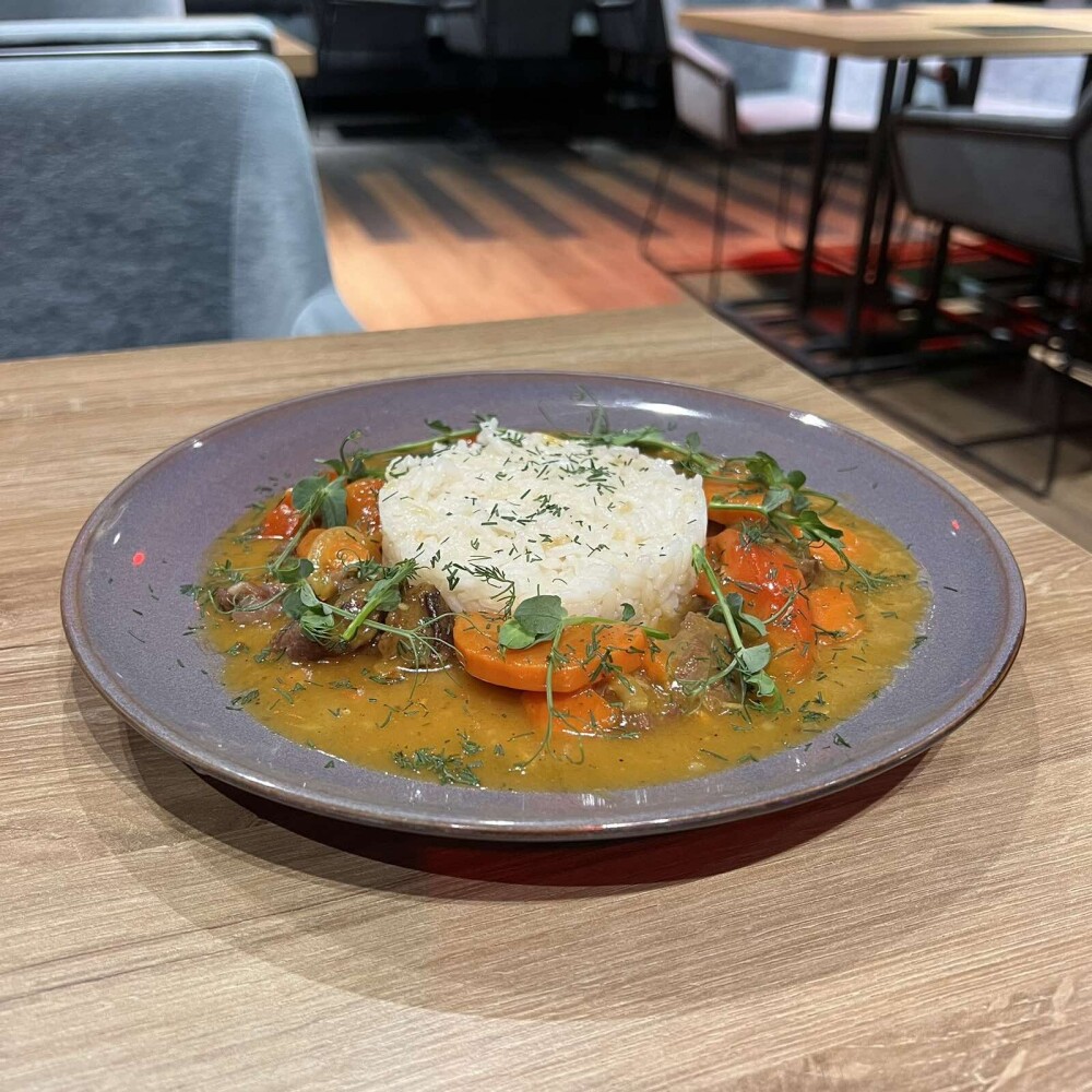 Кусочки говядины, тушенные с луком, морковью, перцем сладким в томатном соусе
