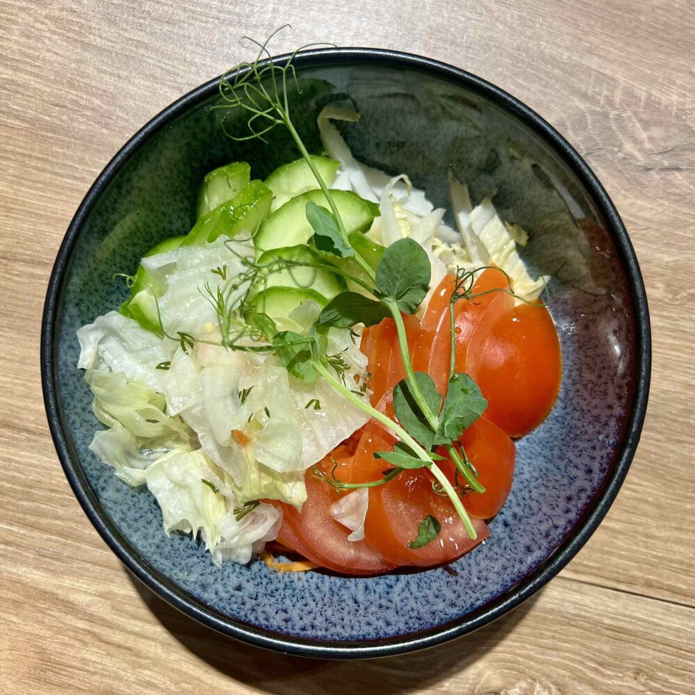 Капуста пекинская, огурцы свежие, помидоры свежие, салатные листья, морковь свежая, заправка