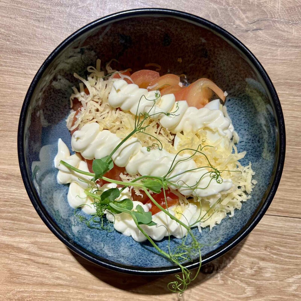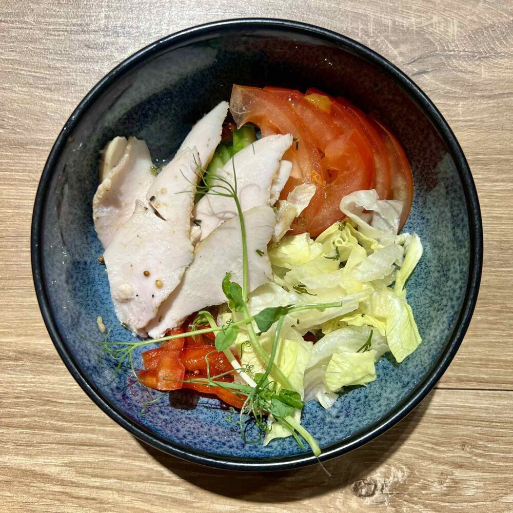 Филе птицы су-вид, огурцы свежие, салатные листья, помидоры свежие, перец сладкий, заправка