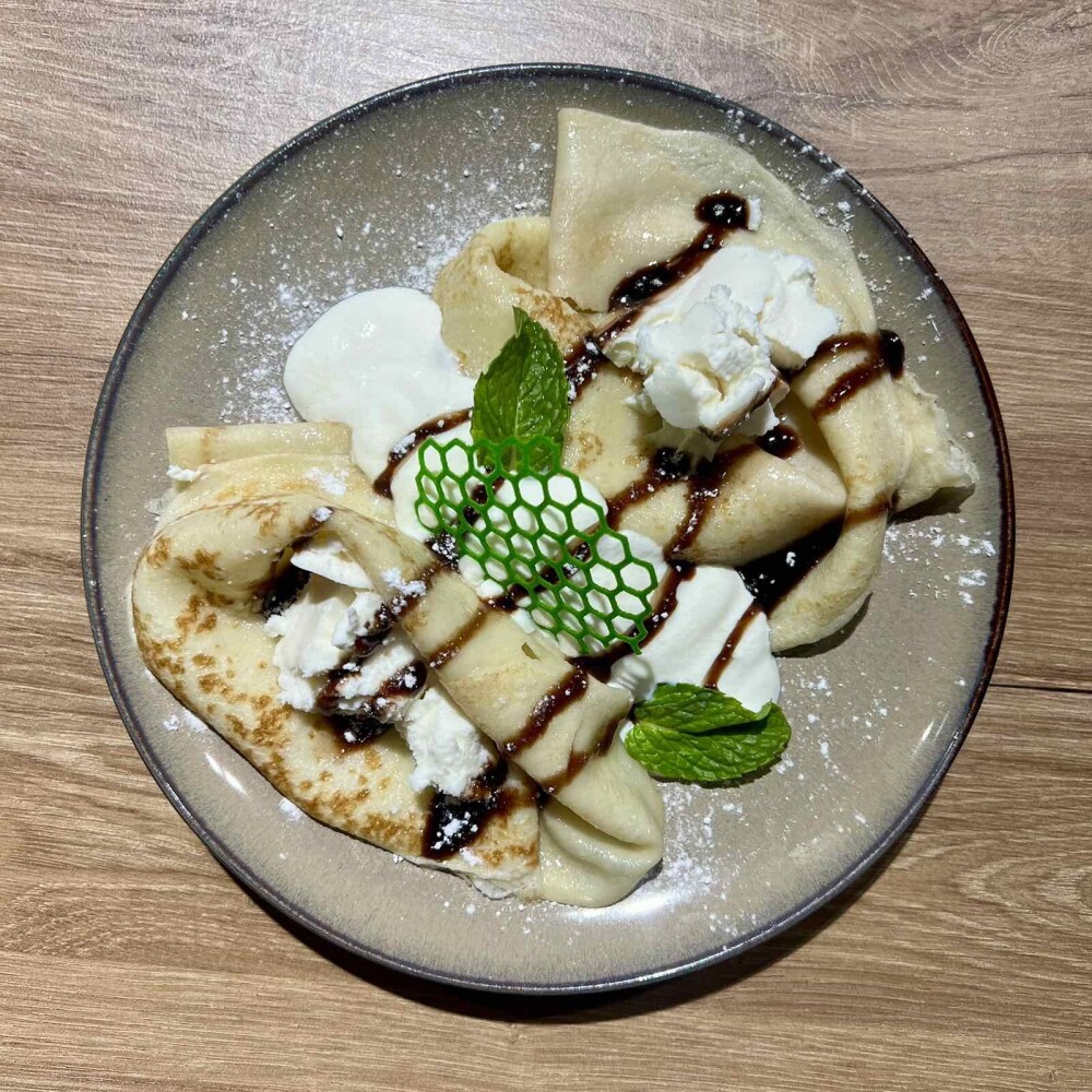 Блинчики с сыром Рикотта со сметаной и шоколадным топпингом