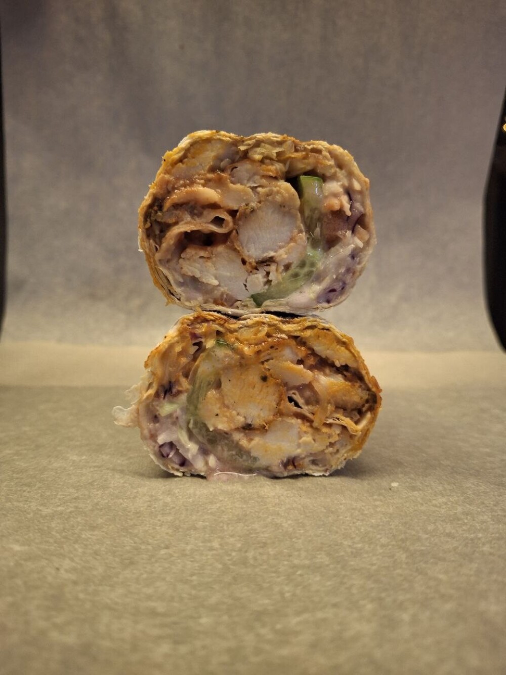 Лаваш сырный, филе куриного бедра жареное на мангале, сыр, салат из капусты, огурчик, помидоры, лук, соус «Чесночный», соус «Томатный»