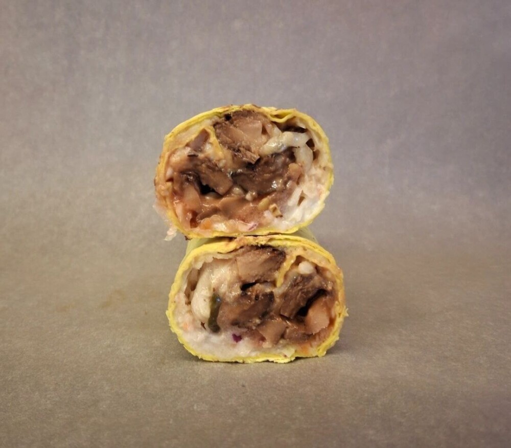 Лаваш, филе куриного бедра жареное на мангале, шампиньоны обжаренные с луком, салат из капусты, огурчик, помидор, лук, соус «Чесночный», соус «Томатный»