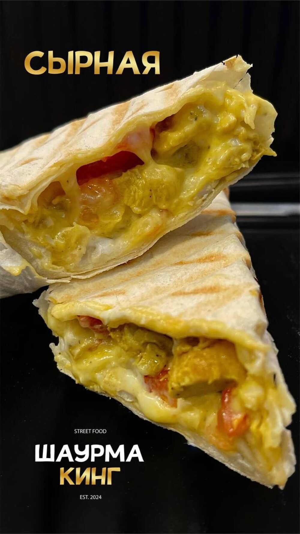 Лаваш, курица, сыр «Моцарелла», помидор, соус «Сырный», соус «Чесночный»