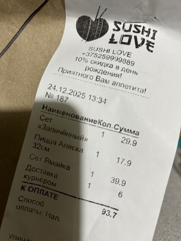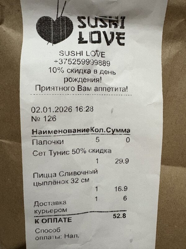 Спасибо огромное за быструю доставку. Все очень вкусное, теплое и свежее👍