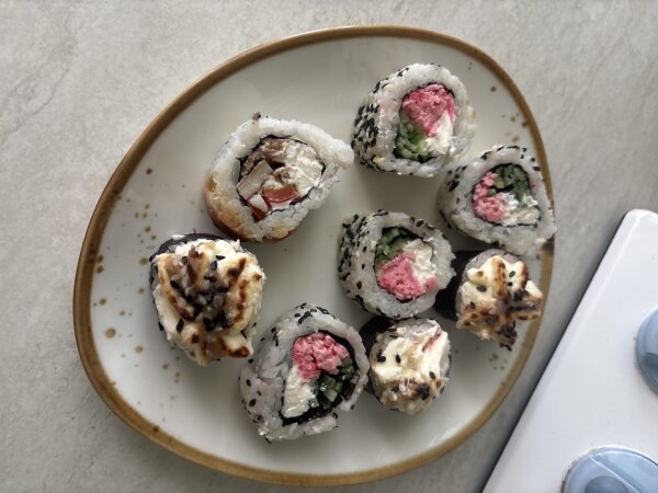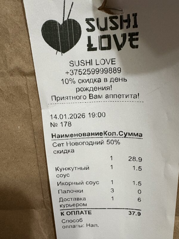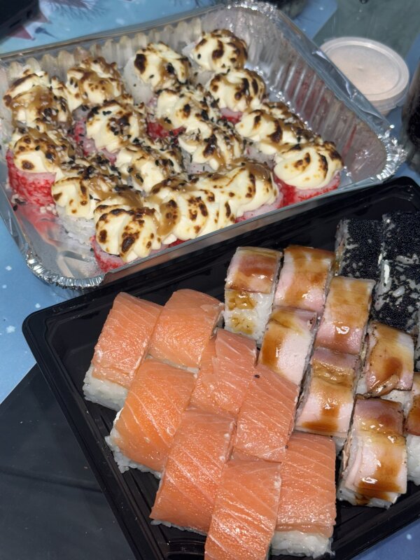 Суши вкусные, доставка была 2ч 20мин, палочек положили 1 комплект, хотя в комментариях попросили 2.