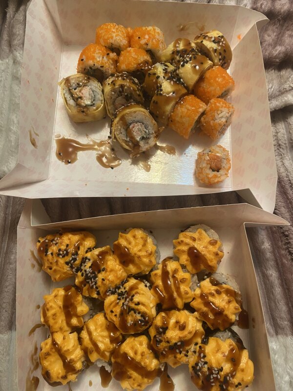 Курьер приятный, попросил прощение за опоздание, суши вкусные и свежие