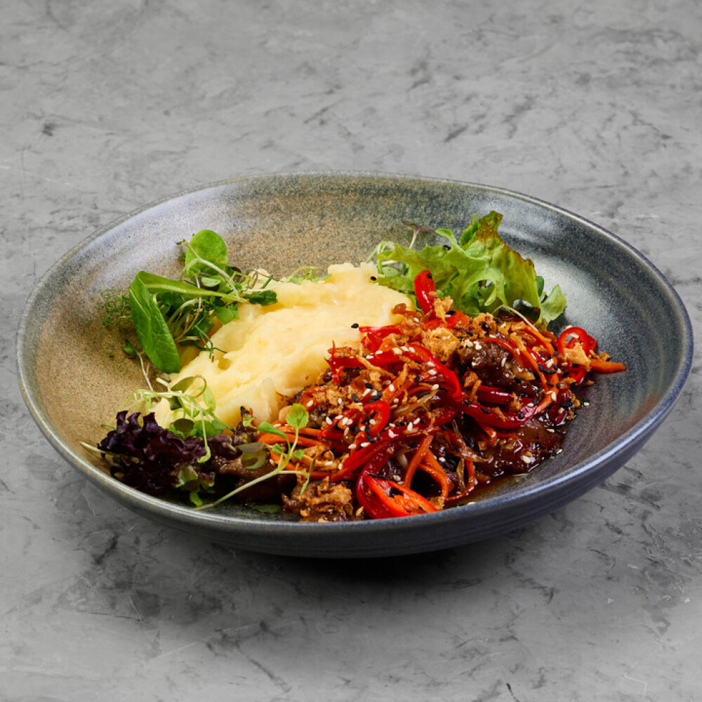 Говядины, помидоры «Черри», ананас, каперсы, базилик, заправка «Бальзамическая», микс салата
