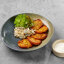 Котлета куриная, картофель фри, помидоры черри, редис, маслины, майонез