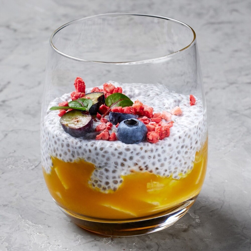 Молоко кокосовое, семена чиа, пюре из манго, банан, ягоды