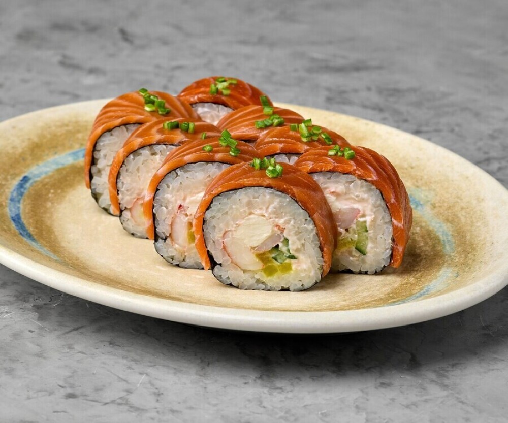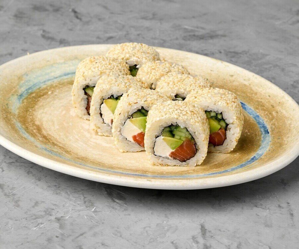 Рис, нори, сыр «Кремчиз», огурец, авокадо, семга, креветки, имбирь маринованный, кляр, соус «Терияки», кунжут