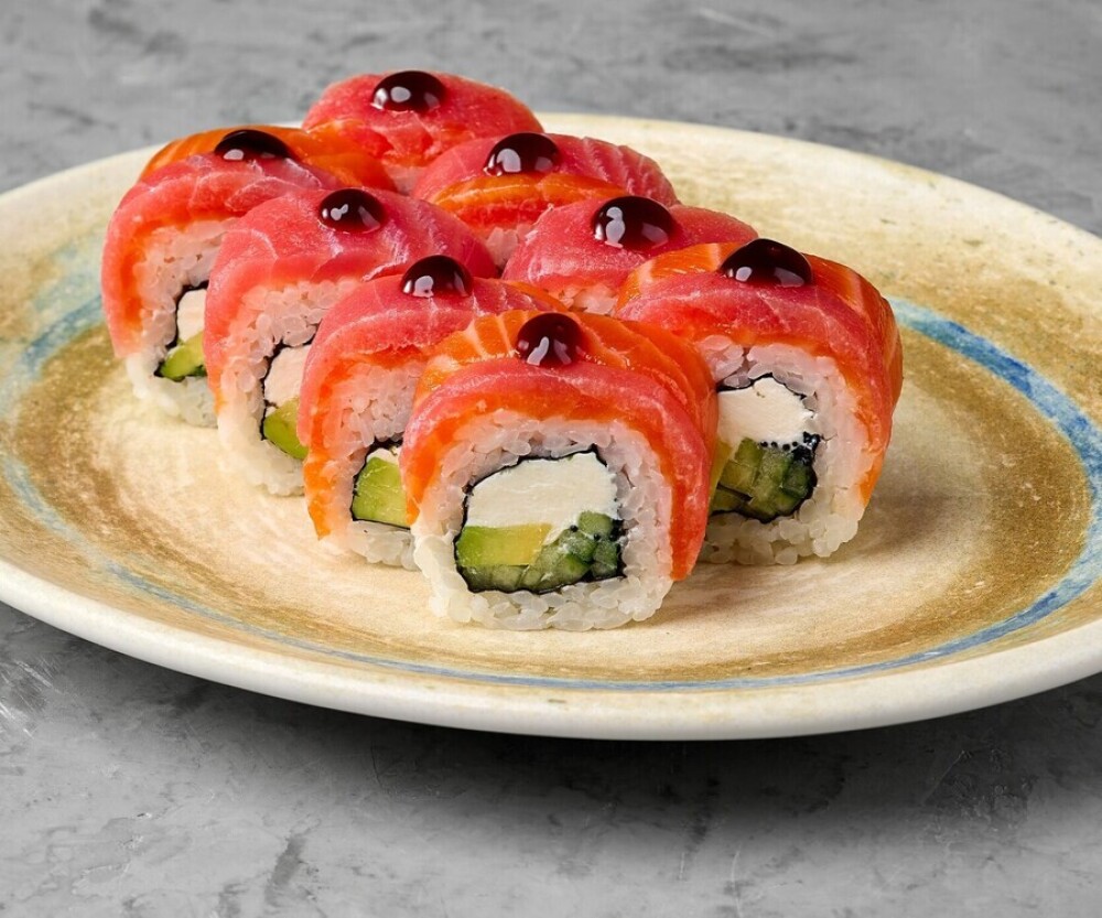 Рис, нори, лосось, тунец, авокадо, огурец, сыр «Кремчиз», икра «Тобико», устричный соус