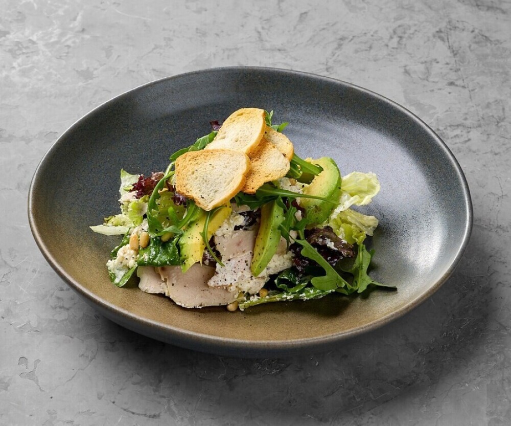 Куриное филе, авокадо, салат, кедровые орешки, хлебные чипсы, заправка с сыром «Креметте»