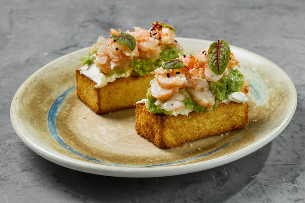 Брускетта с авокадо, лососем, с соусом «Лимонным» и «Терияки»