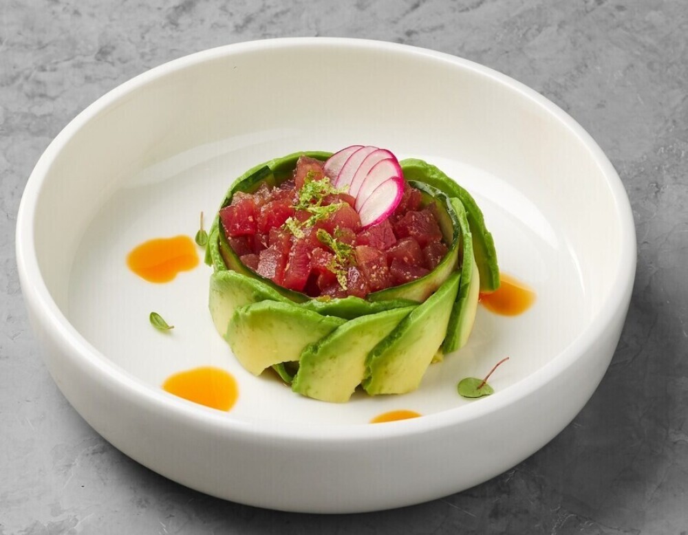 Тунец, авокадо, огурец, заправка с мёдом, соевым соусом, имбирём и кунжутным маслом, редис, микрозелень