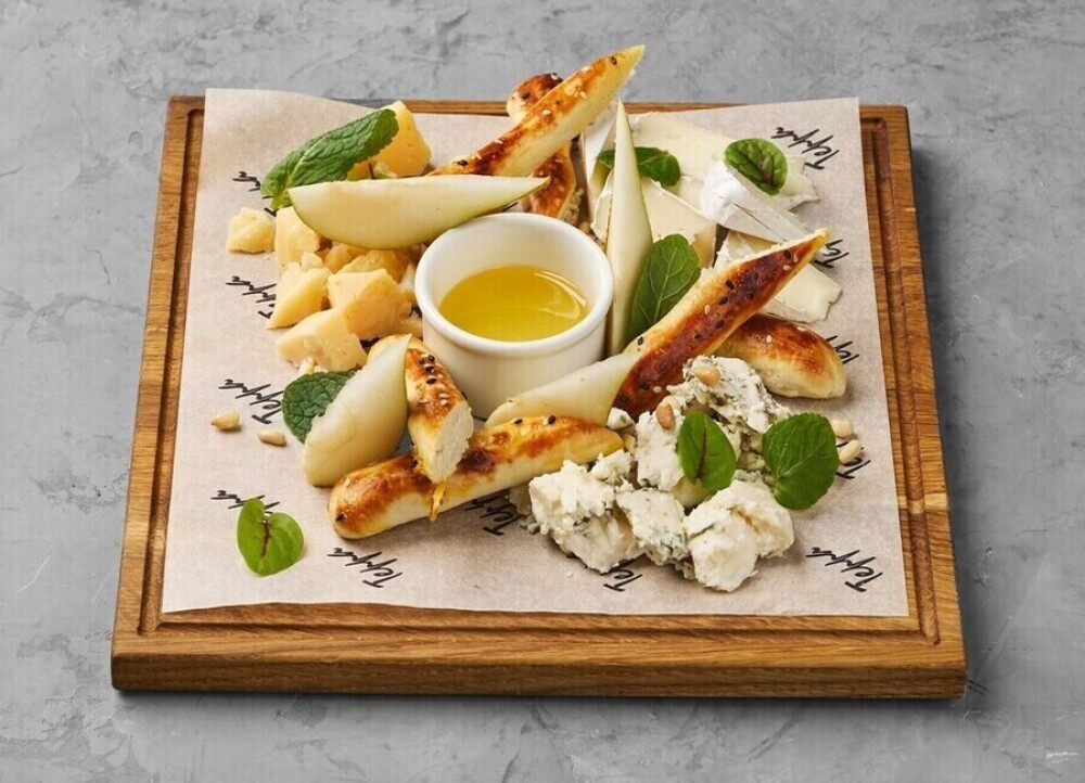 Сыр с голубой плесенью, сыр выдержанный твёрдый, сыр «Бри», груша, гриссини, мёд, орех кедровый, мята свежая, микрозелень