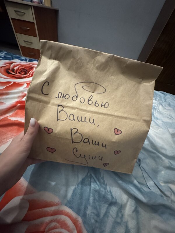 Доставка приехала безумно быстро, персонал очень вежливый. На доставке написали пожелания, которые подняли настроение на целый вечер. Заведение 10/10