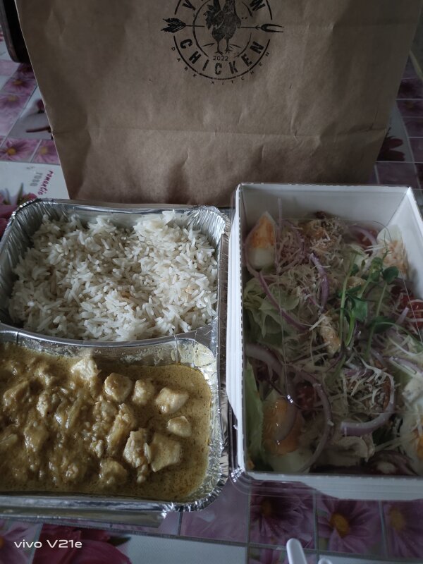 Курица Карри вкусная в меру острая, салат с курицей расстроил половина кожиц курицы вместо мяса, соус обычный есть можно.