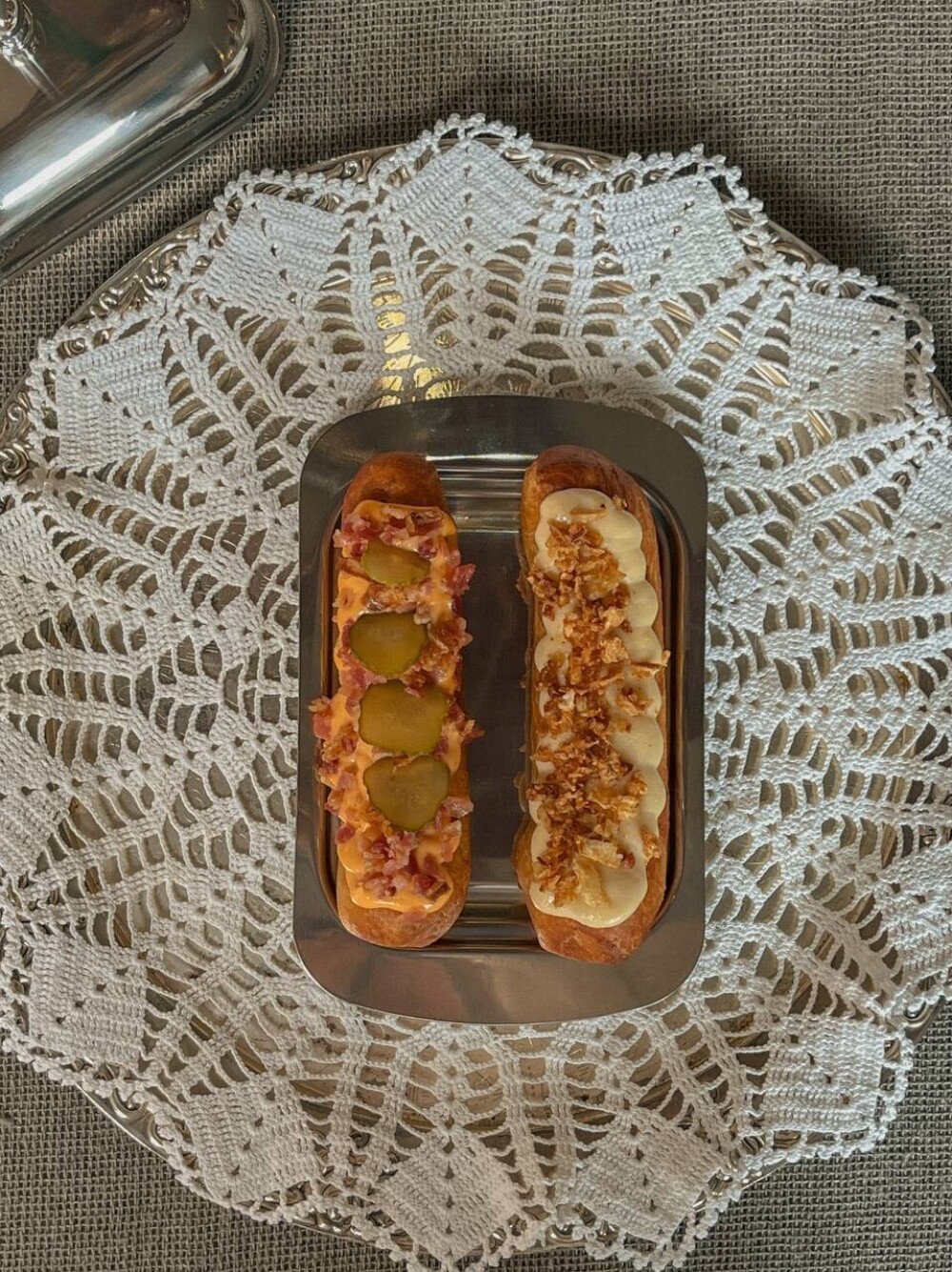 Бенье с красной икрой, отвешенной сметаной и водорослями