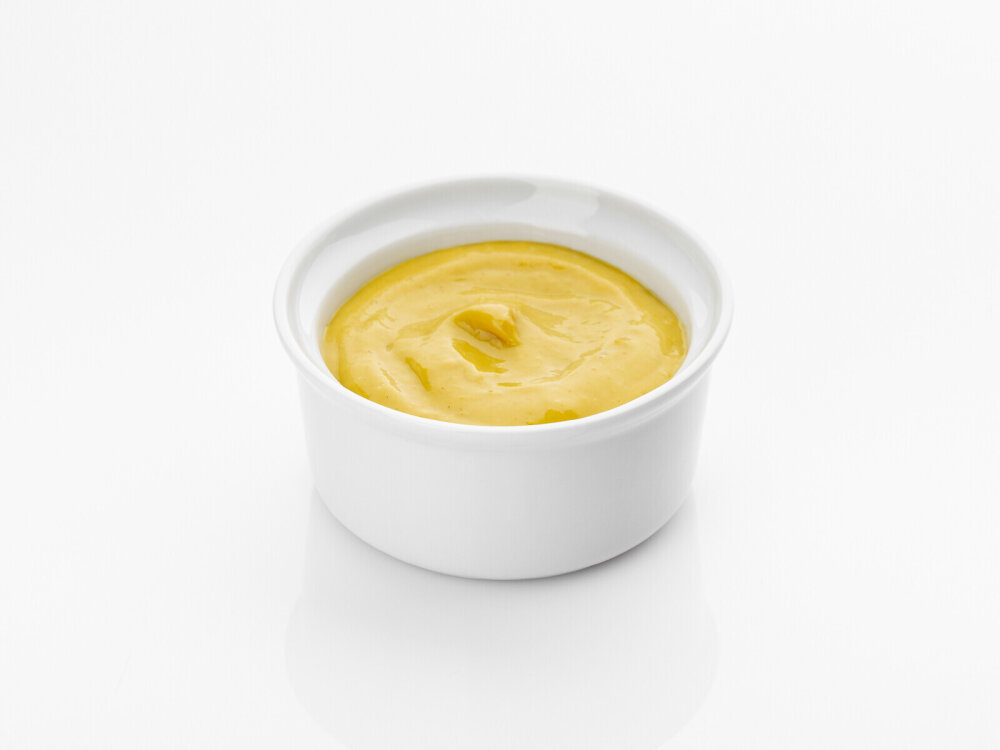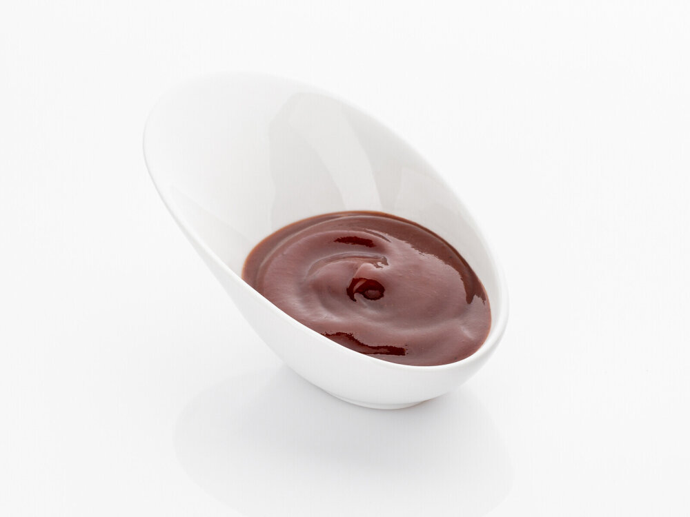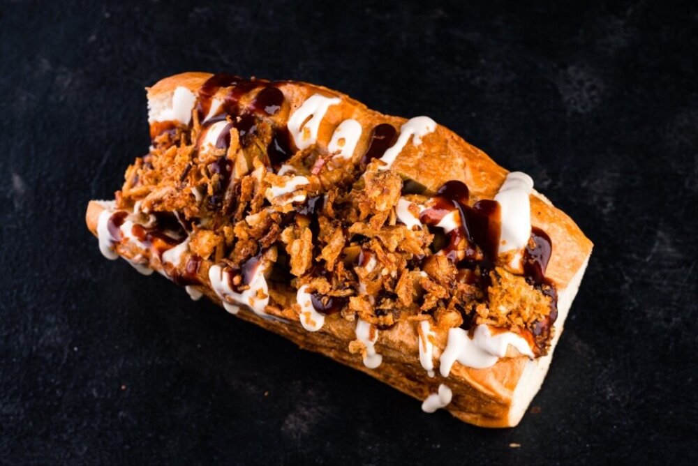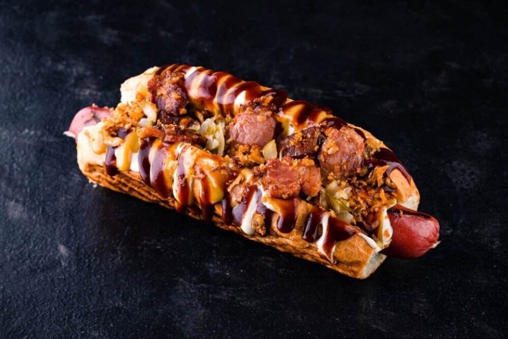 Булочка бриошь, говяжья сосиска, бекон, огурец маринованный, лук жареный хрустящий, соус «Фирменный», соус «Барбекю», горчица «Американская»
