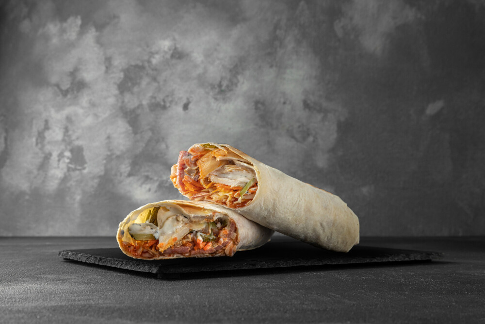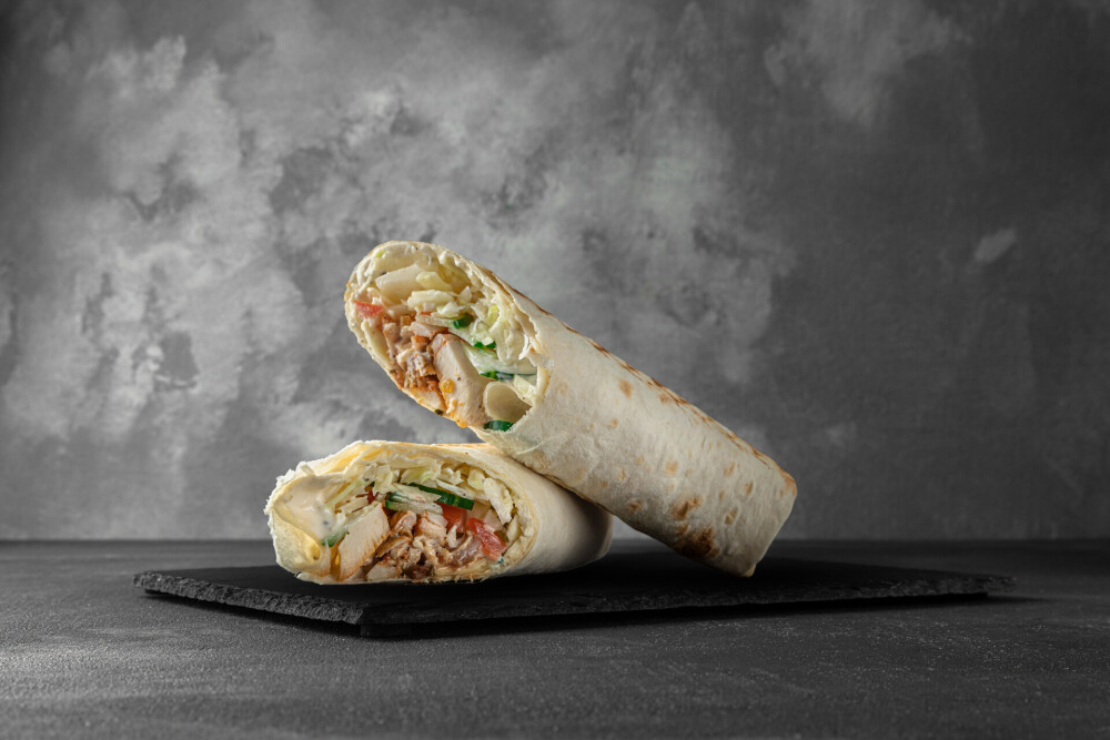 Лаваш, курица, сыр «Моцарелла», капуста белокочанная, капуста кимчи, морковь по-корейски, лук красный маринованный, свежие огурцы и томаты, соус «Фирменный», соус «Сырный»