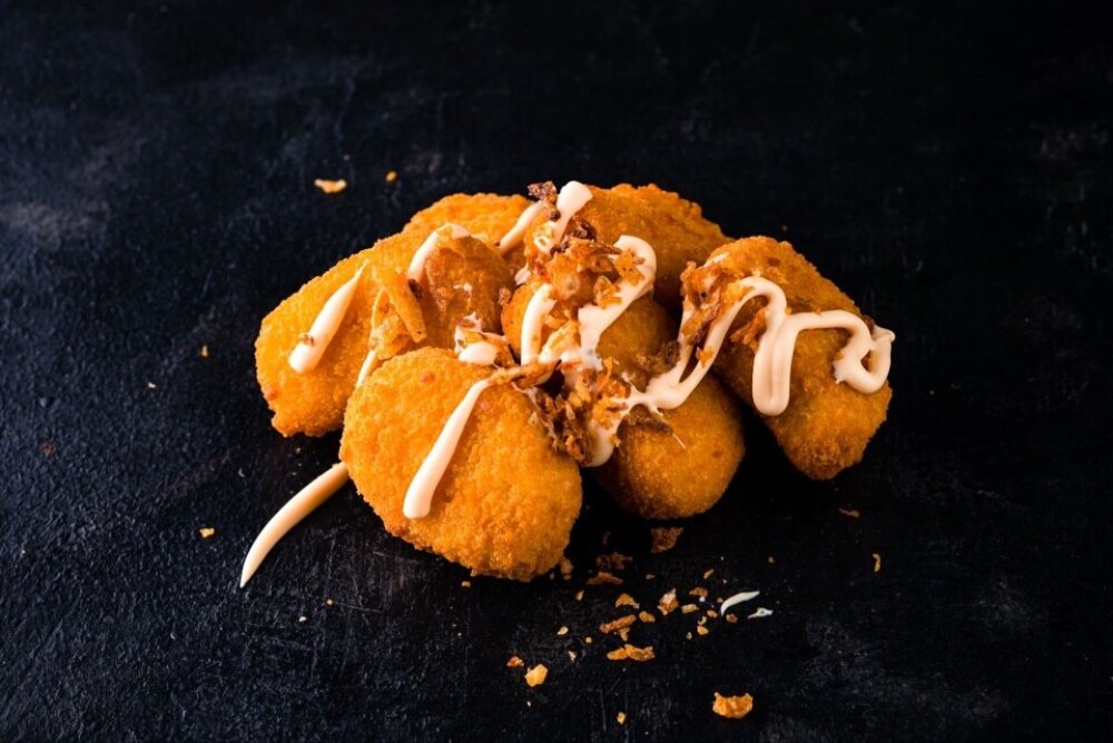 Наггетсы куриные с сырным соусом. Посыпаются жареным, хрустящим луком