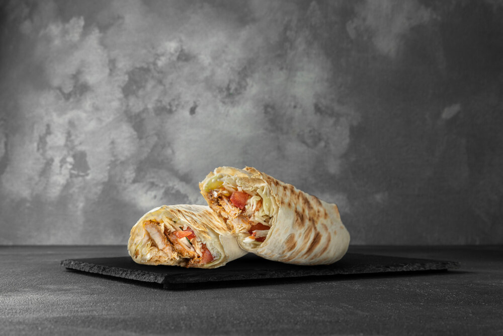 Лаваш, люля-кебаб, сыр «Моцарелла», капуста белокочанная, капуста кимчи, морковь по-корейски, огурцы и лук красный маринованные, свежие томаты, соус «Бургер», соус «Фирменный»