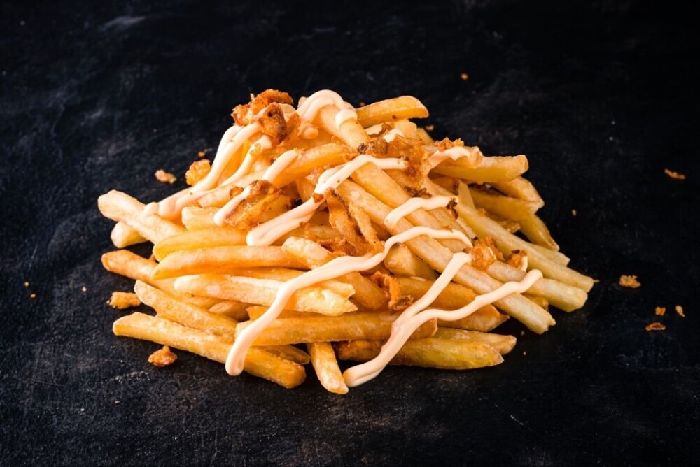 Картофель фри с сырным соусом. Посыпаются жареным, хрустящим луком