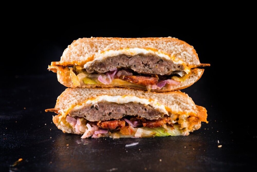Булочка, сочная котлета, бекон, сыр «Чеддер», свежий помидор, листья салата, маринованный огурец и лук красный, соус «Фирменный»
