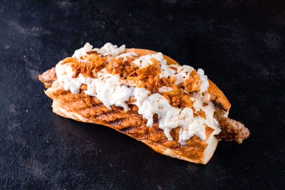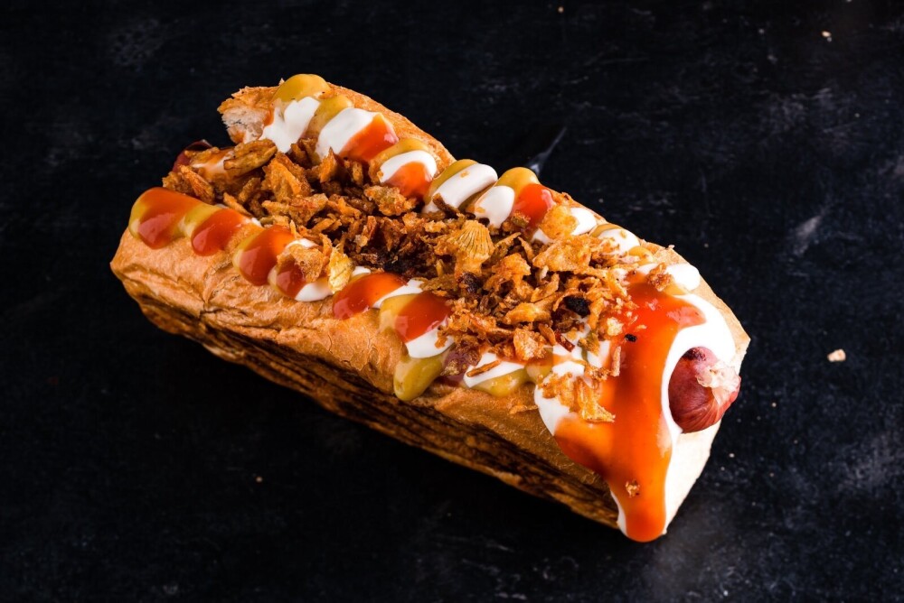 Булочка бриошь, говяжья сосиска, лук жареный, хрустящий, соус «Фирменный», кетчуп, горчица «Американская»