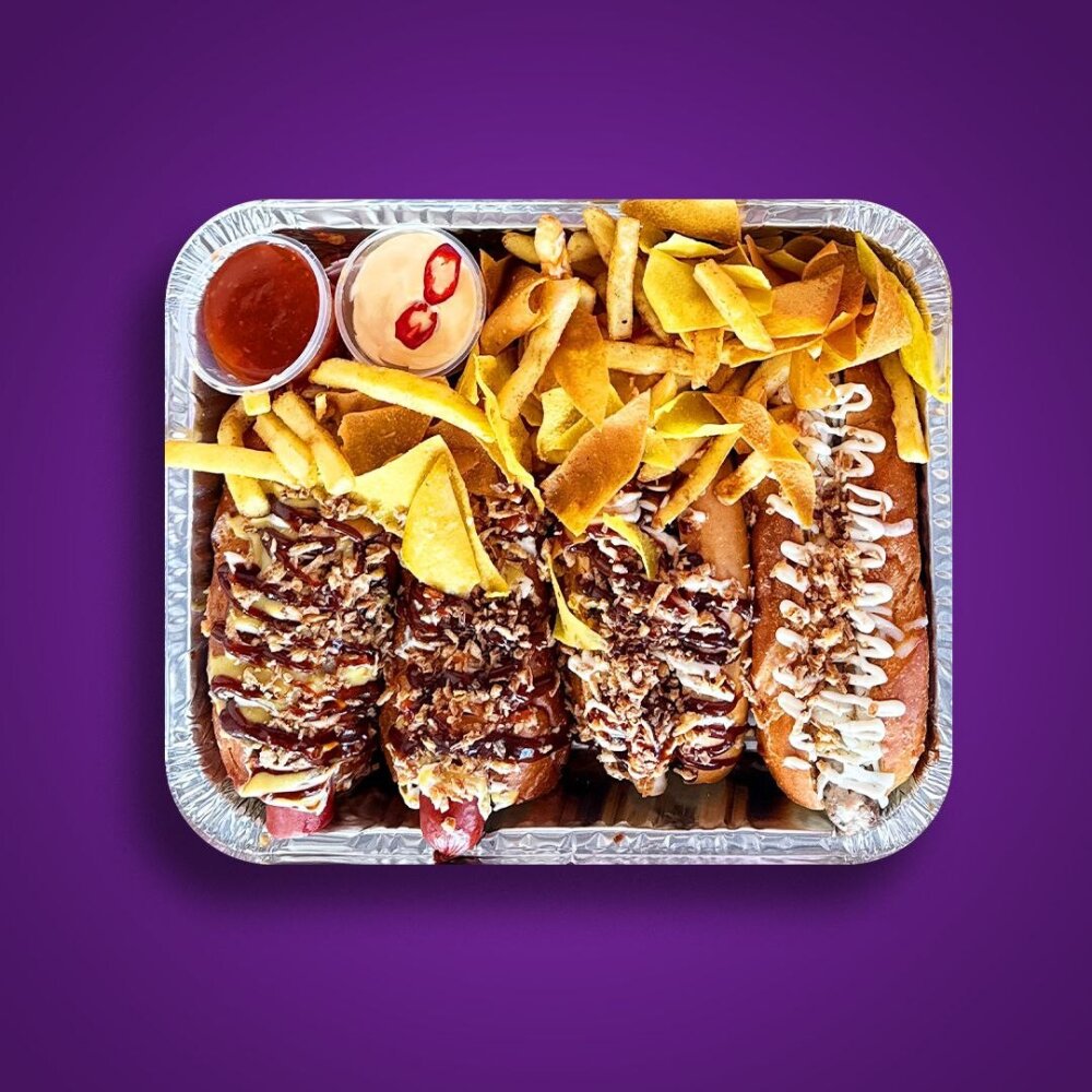 Дог «Classic», дог «Bacon», дог «Tasty», дог «Chicken», картофель фри, чипсы, кетчуп, соус «Сырный»