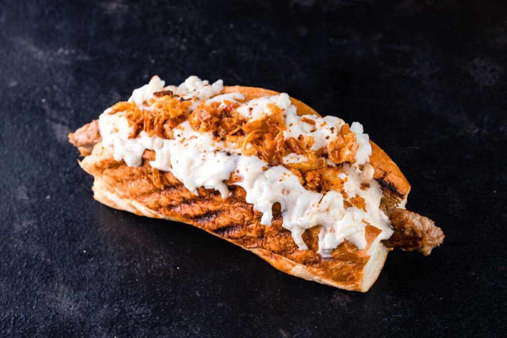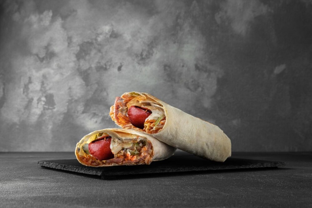 Лаваш, сосиска говяжья, капуста белокочанная, морковь по-корейски, капуста кимчи, лук красный маринованный, свежий томат и огурец, лук жареный, хрустящий, соус «Фирменный», соус «Сырный»