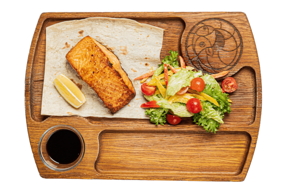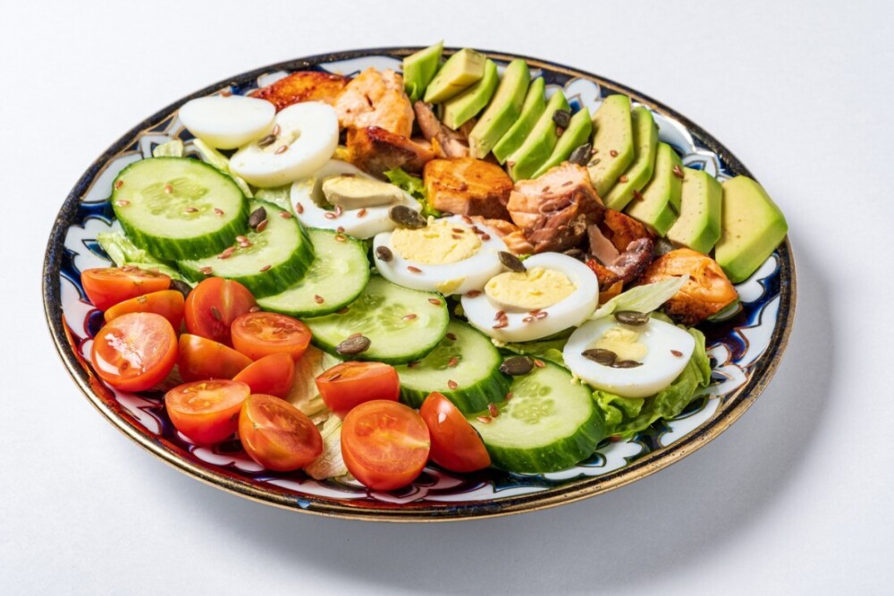 Свежий салат из спелого авокадо, сочных томатов черри, отварного яйца, листьев салата Айсберг и Лола, огурца и семги, приготовленной на гриле. Салат заправляется лимонным фрешем, посыпается льняными и тыквенными семечками.